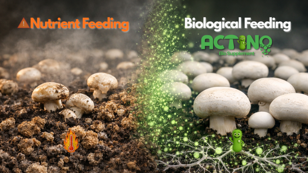 In the realm of mushroom cultivation, most yield-improvement supplements on the market have historically followed a similar playbook: add more nutrients to the mushroom’s growing medium (compost or substrate) to feed the crop. These could be protein-rich meals (like soy or feather meal) or other nutritional additives that mushrooms can use to grow larger and faster. ACTINO Biosupplement Inc. turned this idea on its head by asking a simple question: what if, instead of adding more food for the mushrooms, we helped mushrooms eat the food that’s already there, more efficiently?